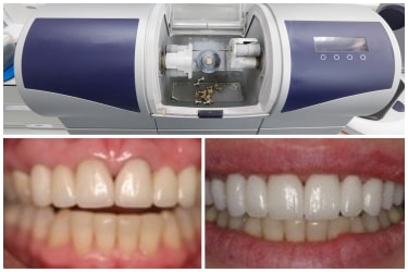 This patient wanted to improve the appearance of the two front teeth, which had recession at gumline and triangular shape. The two crowns were made digitally in an afternoon (2-3 hours) in our office by Dr. Whittle using the CEREC digital technology.